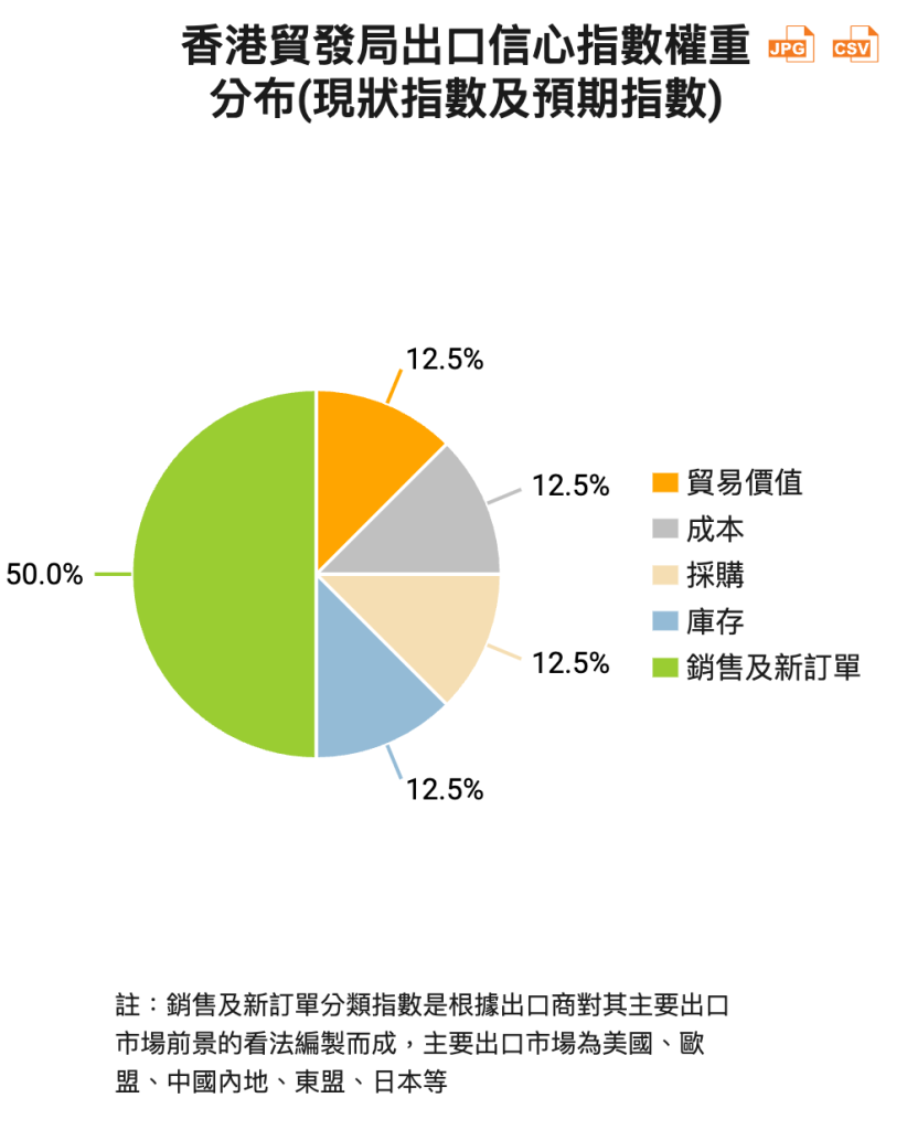 從分類指數看,銷售及新訂單表現轉弱,現狀指數為44.0,預期指數為44.7,雙雙低於50,顯示相關活動受外部環境不穩定影響較大。相對而言,供應面情況較為正面,貿易價值分類指數現狀為50.9,仍處於擴張區間,預期指數則為49.1,徘徊於中性水平。庫存方面,現狀及預期指數均高於60,意味庫存低於正常水平,反映出口商採取較審慎策略。至於成本分類指數則見改善,現狀指數升至38.1,預期指數升至41.3,顯示成本壓力雖仍存在,但已有穩定跡象。