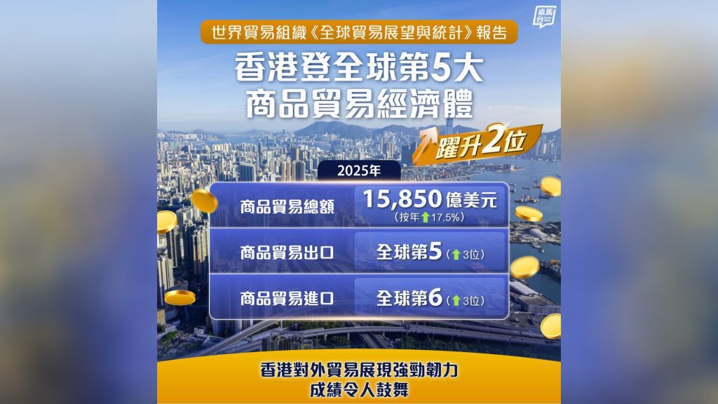 香港中華廠商聯合會對香港躍升為全球第五大商品貿易經濟體表示鼓舞。廠商會指出,在全球地緣政治風險上升、外部不確定性加劇的背景下,香港仍取得亮麗成績,充分展現其作為國際商貿樞紐的堅實基礎、獨特優勢與強大韌性。
