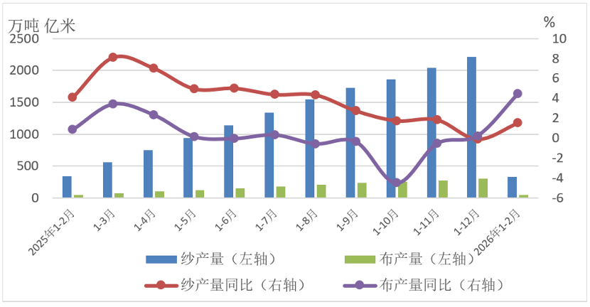 1-2月份,規模以上紗產量爲330.8萬噸,同比增長1.51%,由上年全年累計下降轉爲增長,規模以上布產量爲43.6億米,同比增長4.43%,延續上年全年累計增長趨勢,且增速高於紗產量。
