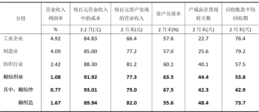 1-2月份,規模以上棉紡織企業與紡織行業企業相比,虧損面低0.9個百分點,營業收入、營業成本及利潤總額增長幅度均更高,顯示棉紡織行業開局平穩,但營收利潤率低1.22個百分點,毛利率僅爲8.08%,盈利能力仍較偏弱。1-2月份,規模以上棉紡織企業產成品存貨週轉天數和應收賬款平均回收期分別較上年年底高出4.8天和4.5天,企業庫存和回款壓力仍然較大。