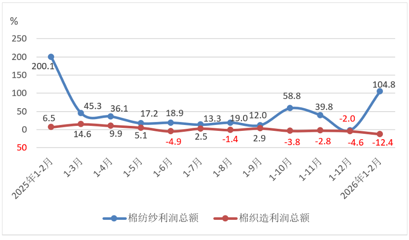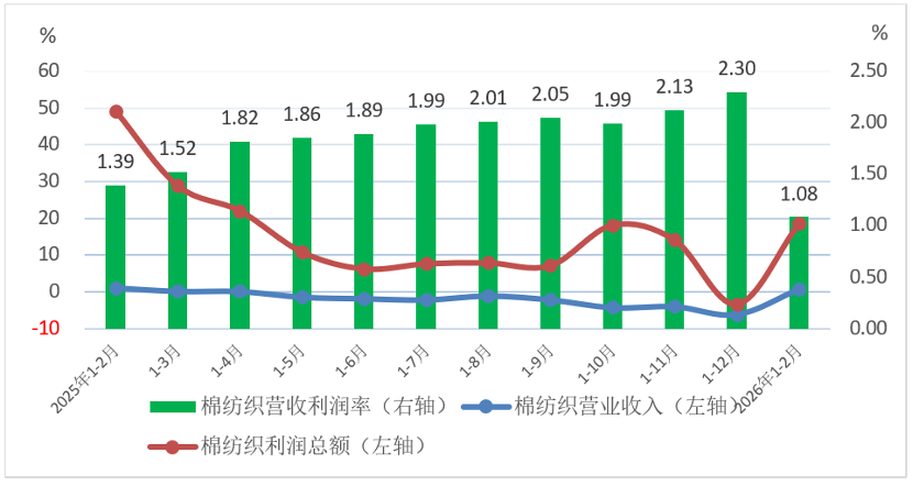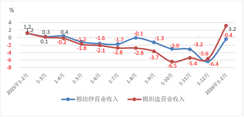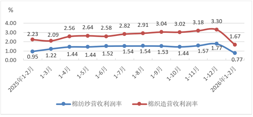 據國家統計局數據,2026年1-2月規模以上棉紡織企業營業收入同比增長0.8%,利潤總額同比大增18.6%,兩項指標均由上年全年累計下降轉爲增長,但營業收入利潤率僅爲1.08%,其中棉紡紗僅爲0.77%,低於上年全年累計和上年同期同比數據。
