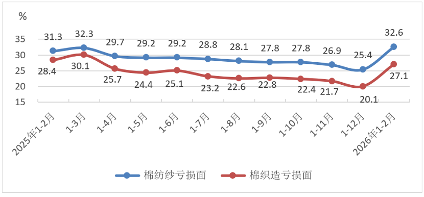 1-2月份,規模以上棉紡織企業虧損面爲30.4%,較上年全年累計擴大7.0個百分點,其中棉紡紗和棉織造虧損面分別爲32.6%和27.1%,較上年全年累計分別擴大7.2和7.0個百分點。