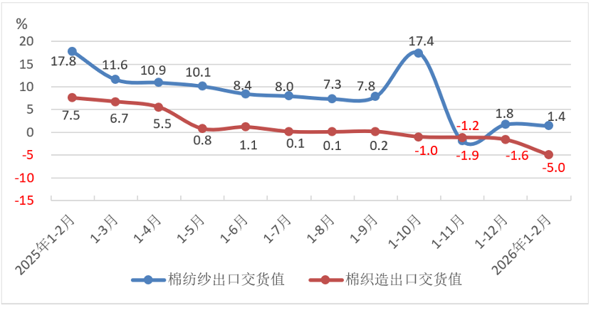 1-2月份,規模以上棉紡織企業出口交貨值同比下降3.0%,延續上年全年累計下降趨勢且降幅進一步加深,其中棉紡紗延續增長勢頭,同比增長1.4%,較上年全年累計增速收縮0.4個百分點,棉織造延續下降趨勢,降幅爲5.0%,較上年全年累計降幅擴大3.4個百分點。