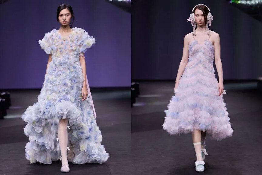 從法國來到中國辦秀,馬吉拉也在設計中,將本土元素轉化為先鋒創意的靈感。如中國的瓷器在本季得到多元演繹。數套高定作品以層疊的印花歐根紗營造出細膩的瓷器質感。在一款造型中,設計師甚至直接將真正的瓷片貼合於人體模型,擊碎後再重新鑲嵌於高定裙裝之上,造就了本季最令人印象深刻的造型之一。