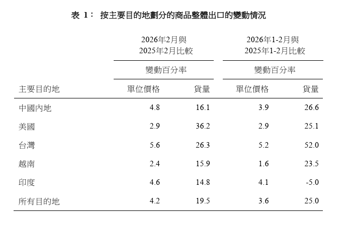 按國家或地區分析,今年2月與去年2月比較,輸往所有主要目的地的整體出口貨量均錄得升幅,其中以美國增幅最大,達36.2%;其後為台灣,上升26.3%;中國內地上升16.1%;越南上升15.9%;印度上升14.8%。輸往所有主要目的地的整體出口價格亦錄得升幅,分別為台灣上升5.6%、內地上升4.8%、印度上升4.6%、美國上升2.9%及越南上升2.4%。