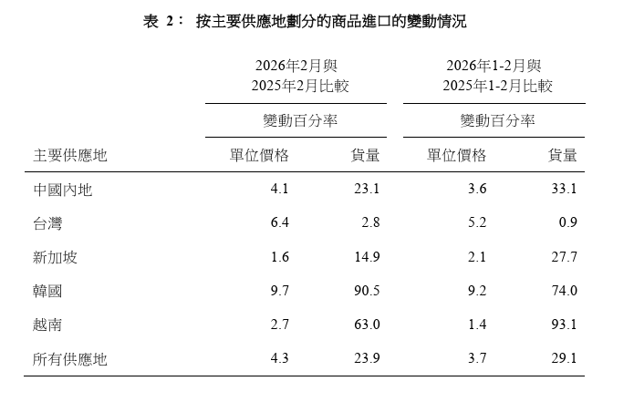 進口方面,今年2月與去年2月比較,來自所有主要供應地的進口貨量均錄得升幅,其中韓國上升90.5%,越南上升63.0%,升幅均逾一半;此外,內地上升23.1%、新加坡上升14.9%、台灣上升2.8%。與此同時,來自所有主要供應地的進口價格亦錄得升幅,分別為韓國上升9.7%、台灣上升6.4%、內地上升4.1%、越南上升2.7%及新加坡上升1.6%。