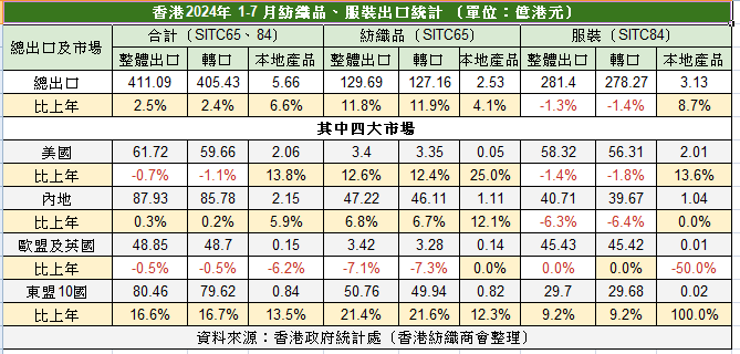 香港政府統計處公布2024年1-7月紡服出口數字,香港紡織服裝出口金額為411.09億(港元,下同),較去年同期減少2.5%。其中服裝出口錄得281.4億,跌幅收窄至1.3%;而紡織品129.69億,彈升11.8%。同時,本地出口錄得6.6%升幅,其中美國、東盟都獲得雙位數字升幅。