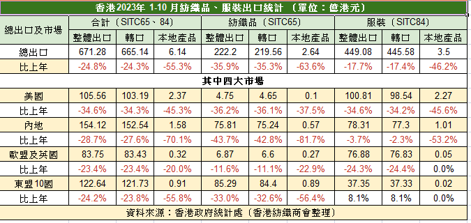 據港府統計處資料,2023年首十個月,香港紡織服裝出口金額為671.28億(港元,下同),較去年同期減少24.8%。儘管全球經濟重啟,而且去年基數較低,可是紡織品出口依然低迷。其中服裝出口錄得449.08億,繼續下跌17.7%;紡織品222.2億,大跌35.9%。