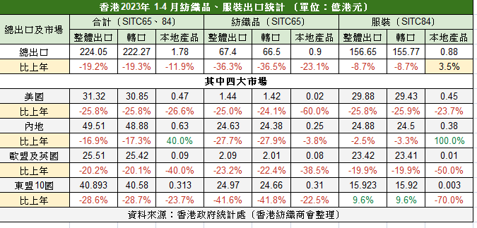 據港府統計處資料,2023年首四個月,香港紡織服裝出口金額為224.05億元,較去年同期減少19.2%。儘管全球經濟重啟,而且去年基數較低,可是紡織品出口依然低迷。其中服裝出口繼錄得156.65億港元,繼續下跌8.7%;紡織品67.4億港元,大跌36.3%。