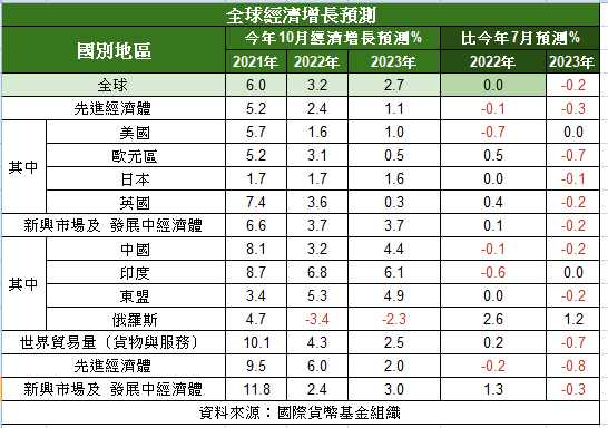 國際貨幣基金組織指出,受高通膨、俄烏戰爭與疫情大流行等一系列挑戰影響,全球經濟增長從2021年的6%,放緩至2022年的3.2%,2023年更將下降至2.7%。這是2001年以來最疲弱的增長情況。中國今年經濟增長率大幅下修至3.2%。