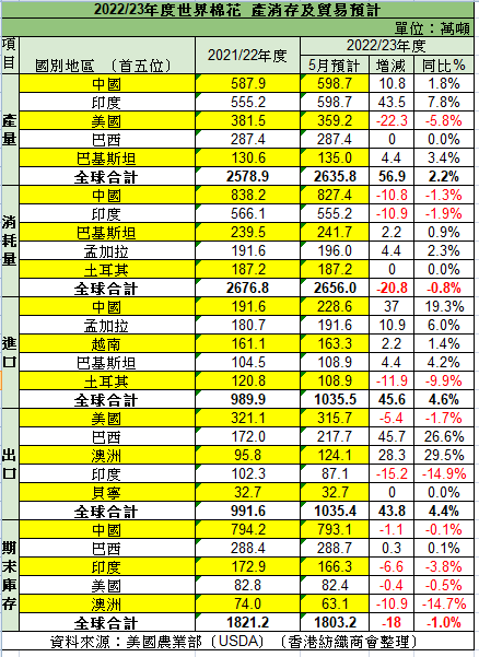 美國農業部(USDA)發布全球棉花供需預測月報,上調2022/23年度產量、進出口同比預期,消費減少。具體特徵如下: