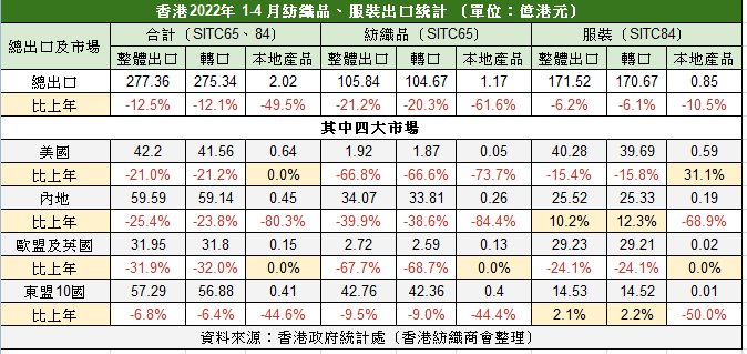 據港府統計處資料,2022年首四個月,香港紡織服裝出口金額為277.36億元,較去年同期減少12.5%。儘管全球經濟重啟,而且去年基數較低,可是紡織品出口依然低迷。其中服裝出口繼錄得171.52億港元,繼續下跌6.2%;紡織品105.84億港元,大跌21.2%。
