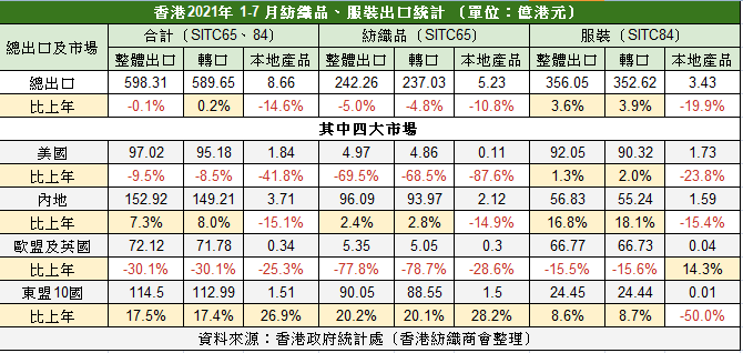經歷了疫情帶來的衝擊後,今年首七個月香港出口稍為止跌。今年1-7月份,據港府統計處資料,紡服出口598.31億(港元,下同),較去年同期幾乎一樣;但是服裝出口同比大減100億後,今年意外錄得回升,達356.05億,上升12.3億,升幅3.6%;紡織品出口則為242.26億,下跌5%。