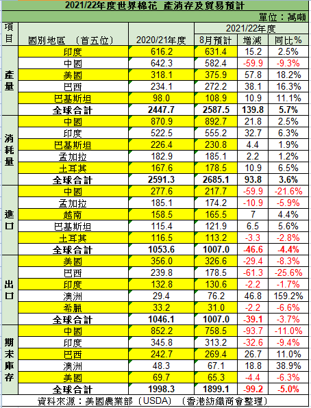 8月13日凌晨,USDA公佈2021年8月全球棉花供需報告,市場焦點主要集中在2021/2022年度的產量和全球消費數據。具體特徵如下: