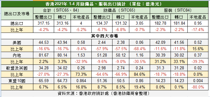經歷了2020年疫情帶來的衝擊後,今年首四個月香港出口開始復甦,但紡織品、服裝(下簡稱紡服)仍然在谷底徘徊。