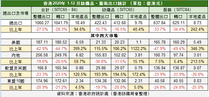 據港府統計處資料,2020年全年香港紡服出口1060.27億港元,較去年同期大減27.5%;其中服裝出口637.84億,較去年同期大減接近330億,減幅33.7%;紡織品422.43億,跌15.7%。許多本地服裝廠轉產口罩和醫用防護服,而且歐美客戶因倉儲低而趕急下訂單,但無法掩蓋因為經濟不景而造成的紡服出口數字大跌。其中輸往美國的服裝同比大跌47.9%;輸往內地的整體出口亦跌19.6%。市場上仍充斥太多不明朗因素,疫情影響歐美經濟,不少零售大企縮減規模,中小企結業,令歐美買家減少買貨。