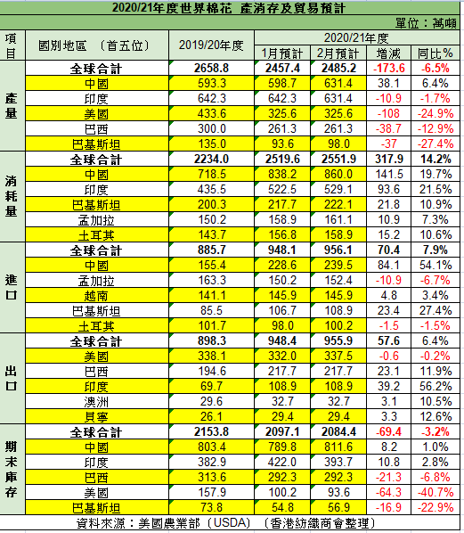 近期美聯儲、歐州央行及其它主要經濟體2021年延續寬鬆的貨幣政策,通脹壓力持續向股市、大宗商品期貨市場傳導,令棉價不斷上升。2月美國農業部(USDA)發布全球棉花供需預測月報,顯示2020/21年度全球棉花產量、消費量和進口量均比1月上調,主要是由內地市場的變化所導致。本月全球產量較1月上調27.8萬噸,而內地的產量預計上調32.7萬噸。全球消費量預計上調32.3萬噸,其中內地上調21.8萬噸,反映出國內的紡織品需求和出口方面的增長。印度、巴基斯坦、孟加拉國和土耳其的增幅較小,而印度尼西亞和泰國的消費量預計將減少。
