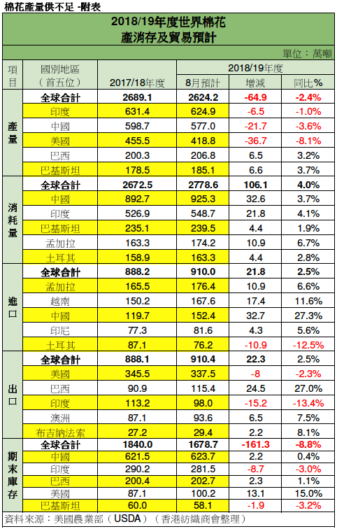 据美国农业部(USDA)统计,针对2018/19年度全球棉花市场形势是供不足需,产量2624.2万吨,落后于消耗量2778.6吨。尤其是美棉的预计产量更下降达8.1%,棉花供应下滑、消费增长或导致压力突出、棉价上涨。具体特徵如下: