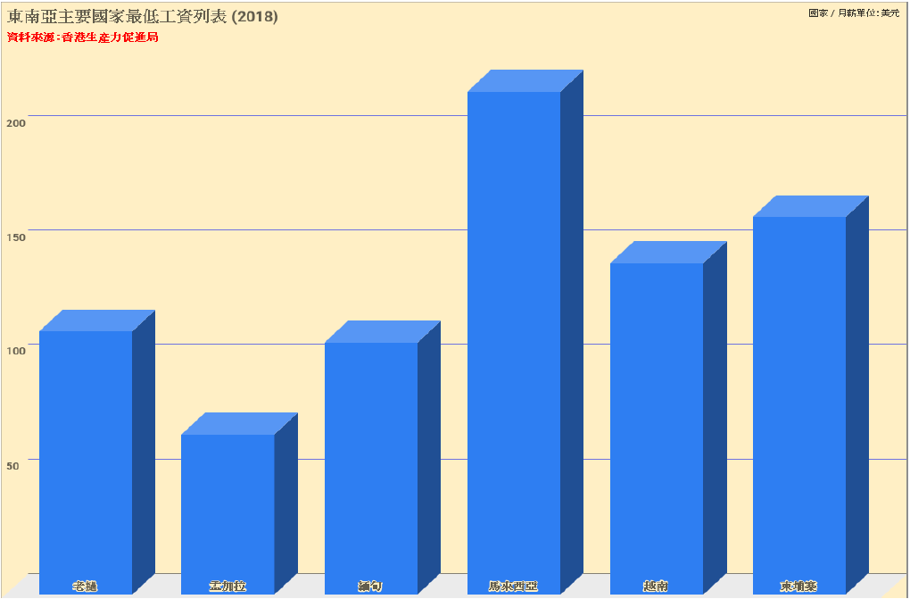 相对较低的工资,是缅甸的优势之一,该国的劳动力人口佔总人口64%。製造业主要集中在服装和纺织品、农业加工等行业,缅甸政府正鼓励对製造业进行更多投资,特别是在包括中小企业在内的服装业。他们欢迎香港投资者加大投资,特别是在克伦邦和若开邦,因为这些地区强调与仰光或泰国之间交通方便,又有年轻和廉价的劳动力,并提供24小时充足电力。从前,电压不稳定素来是缅甸製造业一大问题,容易令厂商的机器设备加速折旧。