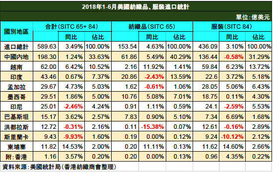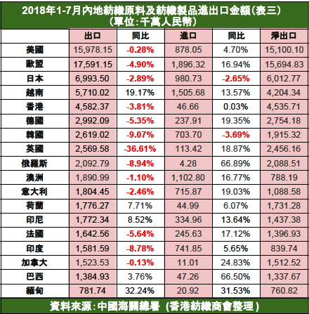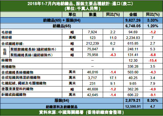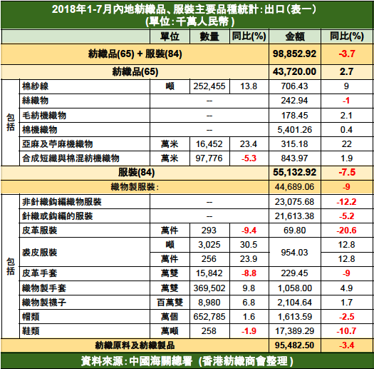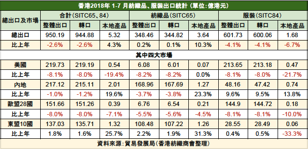 由于贸易战阴影及中美对抗情绪加剧,今年以来,中、港股市剧烈波动下行,与此同时人民币贬值令中国内地进出口亦有所影响,但香港首七月纺织品、服装(下简称纺衣)出口暂未受到严重影响。