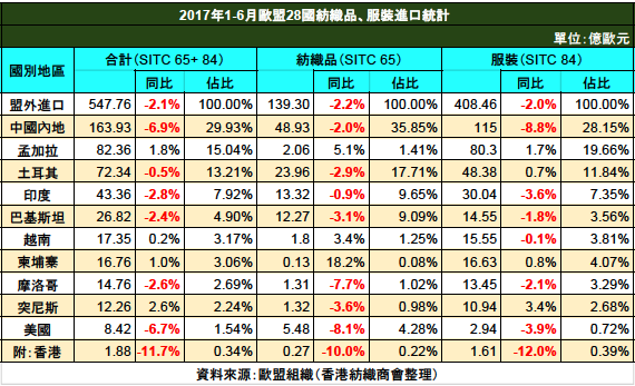根据欧盟组织统计,2018年1-6月欧盟进口纺衣(按标准国际贸易分类SITC 65、84)与2017年同期相比跌2.1%。个别国家表现如下: