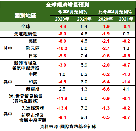报告说,疫情对2020年上半年经济活动的负面影响比预期更为严重,因此预计復甦将比此前预测更为缓慢。基于下半年继续保持社交距离、经济创伤加剧、企业增加卫生安全措施以及金融环境保持现状等基准假设,IMF预计全球经济今年将萎缩4.9%,但有望在2021年增长5.4%。IMF将中国今年经济预测由增长1%,较4月预测时下调0.2个分点;预计2021年增长为8.2%,较上次预测下调1个百分点。IMF指出,下调预测主要由于消费復甦逊于预期,但中国的復甦仍在正轨,预计未来数月经济表现会比现时好很多。IMF又提到,中国是最先出现疫情,同时亦是最新重启经济的地区,中国復甦对全球经济而言有好处。