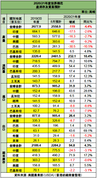 据美国农业部(USDA)8月公佈的报告显示,全球棉花消费量开始復甦,2020/21年度八月预计消耗2461.5万吨,同比增长10.4%。全球前十大消费国的消费量预计增长,中国和印度总共增加130.6万吨,佔全球增长的六成。不过,由于疫情的影响还会存在,全球消费量仍低于前几年的水平。具体特徵如下: