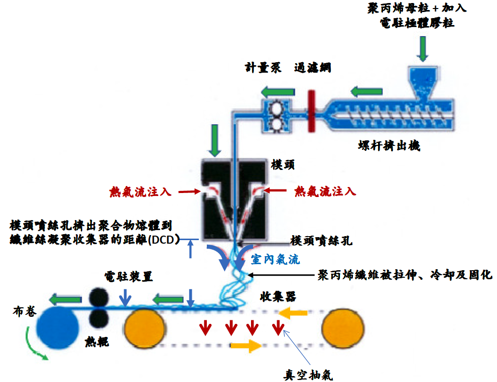 鑑于熔喷不织布对防疫口罩生产的重要性,涉及高品质及高科技挡次,本人就此简略介绍一下熔喷不织布生产关键技术,藉着调控可变技术参数包括纤维材料、螺杆挤出机温度及速度、热空气温度、热空气流量、熔喷模头温度、模头喷丝孔挤出纤维聚合物熔体到凝聚收集器的距离,收集器速度等量数都可调校,达致所需纤维直径细度和纤维网横向和纵向均匀度、重量, 孔径大小等等, 都取决于上述参数互相调校及正确选择[1]: