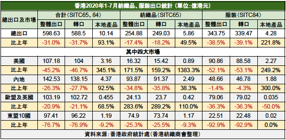 全球疫情持续不断,商业活动陷入停顿重开无期,本港出口数据已反映出疫情带来的影响。据港府统计处资料,今年1至7月香港纺织品、服装(下简称纺衣)出口598.63亿港元,较去年同期大减31%;其中服装出口343.75亿港元,较去年同期大减超过200亿,减幅38.5%;纺织品254.88亿港元,跌17.4%。