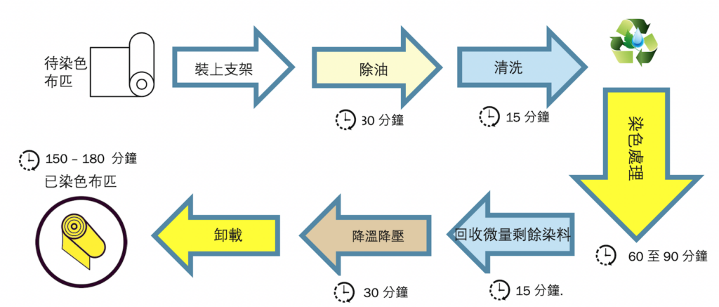 运作方法类似横式染色系统(BEAM DYE),以低温高压状态下进行:织物被放置在容器的中央管道上,悬挂在染色容器内便开始脱油、冲洗,之后开始进行染色。液体经过冷冻、加压、加热变成流体)、最后化为循环流体(即「超临界状态」),并带染料深入到纤维的结构中,布疋从而着色。而染色过程中,织物是完全静止,一直浸泡在高浓度的染料流体中。直至达到饱和状态就完成染色,剩下的CO2及颜料会经加热变回全气体,颜料会沉淀于分离器裡回收,C02则冷却后转成液体反回储存罐,日后可以可循环再用,而且不会有副产品排放。同时,如果有做製软/功能布需求,只要在另一个釜放入助剂,透气快乾、凉感、除臭功能等等全部都可以做到。成品完全乾身,亦可做到不同颜色。