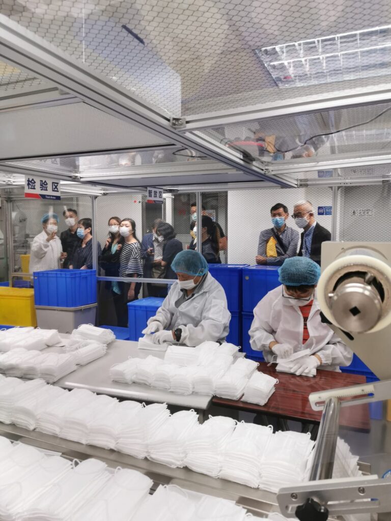 9月3日,会长朱立夫(左三)、副会长宋敏之(右二)及副秘书长陈家龄(左一)参观香港熔喷布厂「香港熔喷製造有限公司」及「口罩王科技有限公司」,其后与该公司董事长黄特平(右三)了解生产过程及进行意见交流,了解工厂建设情况。「香港熔喷」现时有2条生产线,生产达到ASTM LEVEL 3标准的熔喷布,「口罩王」使用「香港焙喷」的原料作为中间滤芯,成品亦已取我ASTM LEVEL 3认证,共20条全自动口罩生产线,预算增加至40条生产线,每条生产线一分钟可生产90个口罩,生产过程不经人手,口罩均独立包装,客源为本地大企业,亦有代工及外销订单。 (图1 )