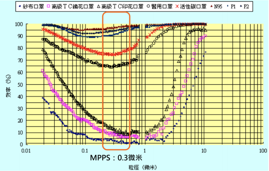 如何鑑别口罩过滤效能?通常比较可靠的口罩在防范MPPS(0.3微米)的粒子达到90%以上的过滤率,这种大小的粒子会容易影响到人类的呼吸道气管,形成呼吸系统疾病,需要用口罩来防止进入人体。而另外,MPPS粒子亦比较容易在空气中存留传播,甚至停留超过一个半小时(相比之下100微米粒子则只能存留5.8秒)。冠状病毒大小大约为0.1微米,比起一般细菌(0.5微米)、PM2.5粒子(2.5微米)、头发(7微米)都要小,所以非常难阻隔。